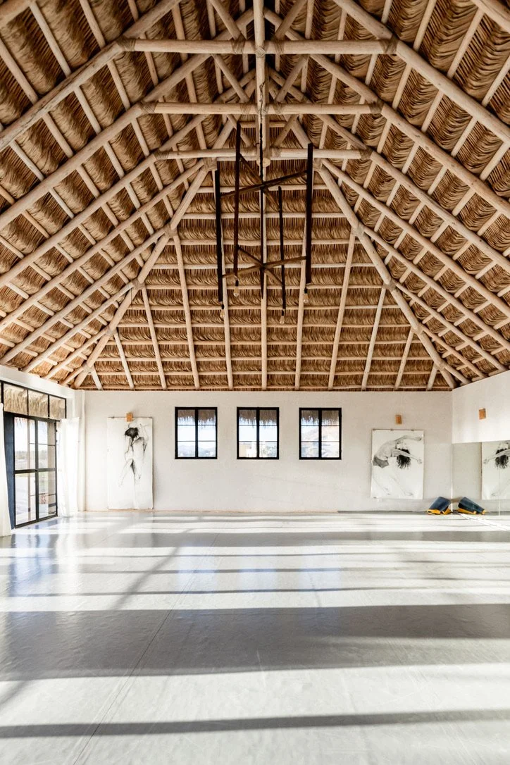 A spacious, palapa-covered practice studio with sprung wood floors and floor-to-ceiling doors opens west toward the farms and sea, inviting open-air movement and sunset light. Indoor living areas flow effortlessly onto outdoor dining terraces and lounge spaces tucked among palms, cactus, and native flora. Guests can unwind in hammocks by the fire pits, rinse off in the outdoor shower after the beach, or settle into the infrared sauna and soaking pool.