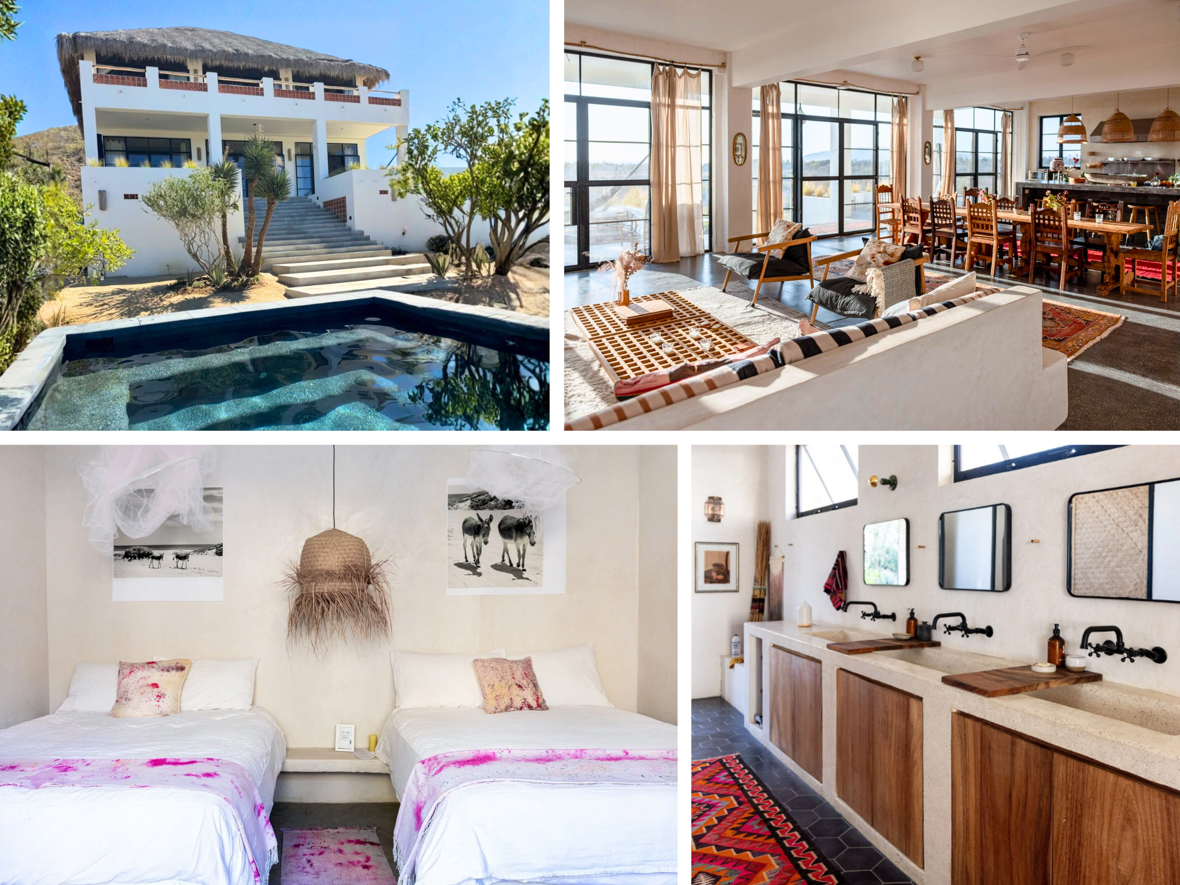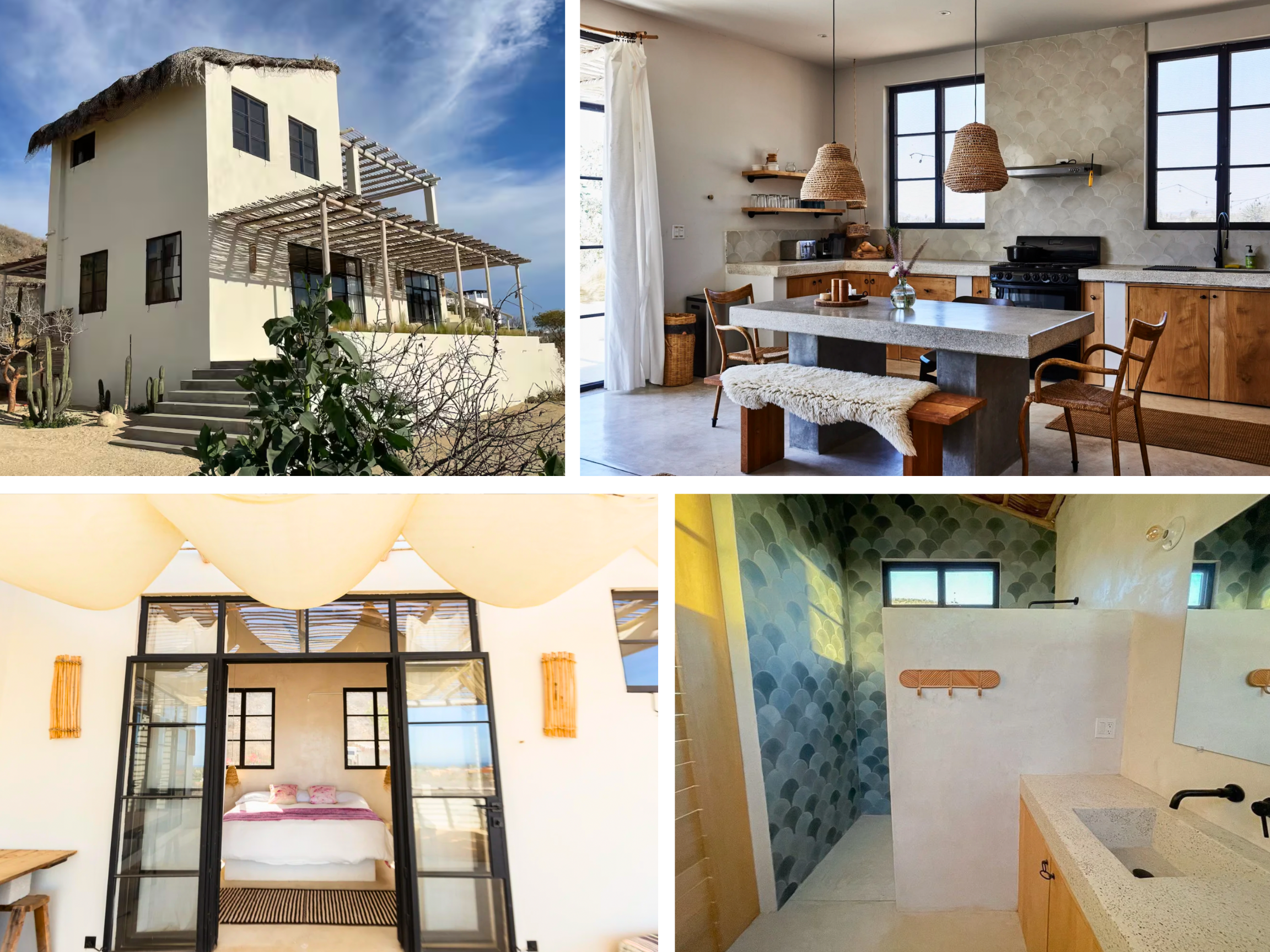 El Campo has two fully equipped houses on its property — the Mill and La Casita — each with its own vibe, sunlit patios, and shaded terraces. Both blend modern simplicity with Baja warmth, overlooking the Pacific, farmlands, and mountains, and offer shared access to the soaking pool, open-air practice space, and surrounding gardens.